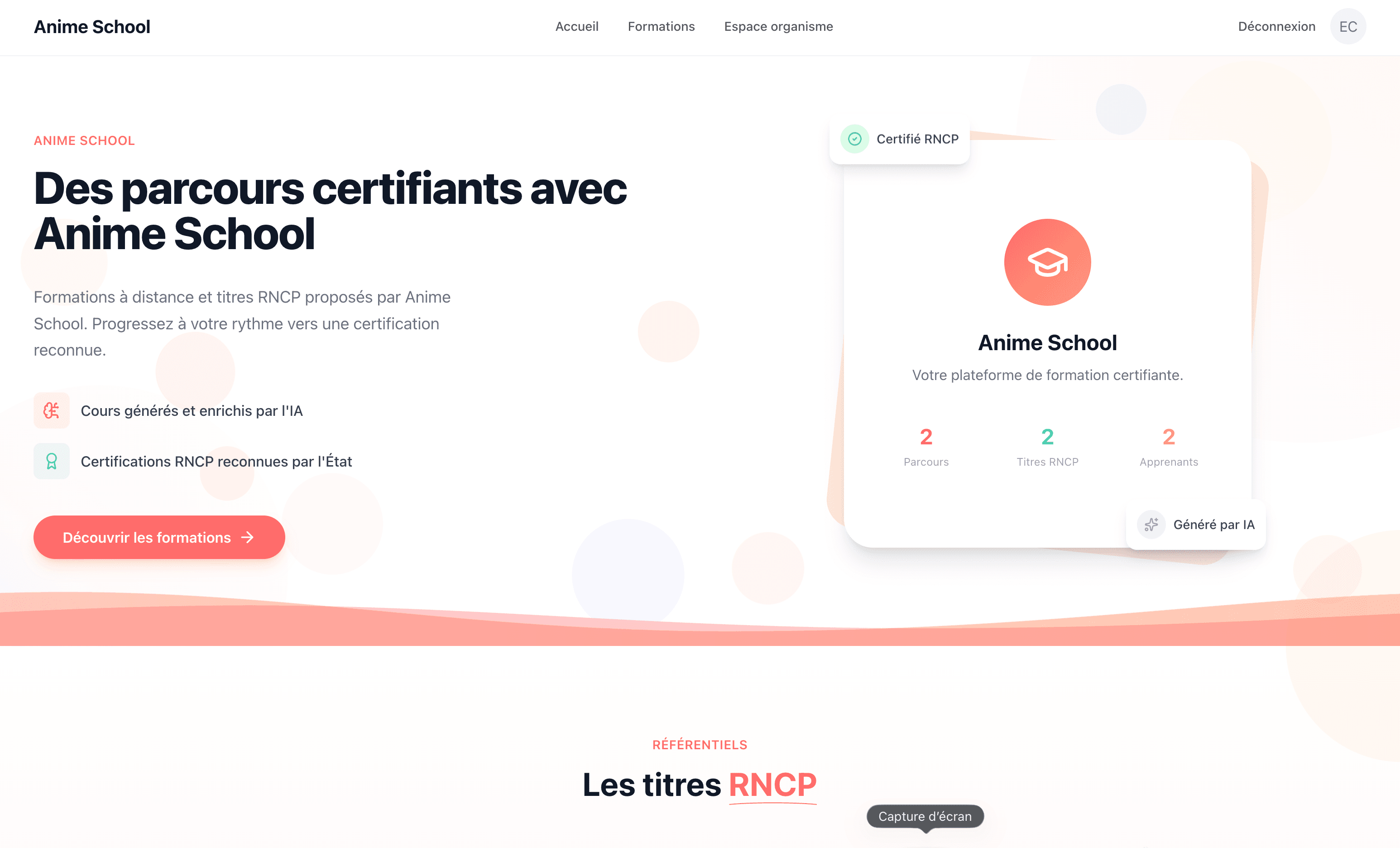 No-CodePlateforme E-learning en marque blanche propulsée par l'IA — un PDF RNCP en entrée, une formation complète (cours, quiz, scripts vidéo, podcasts) en sortie.