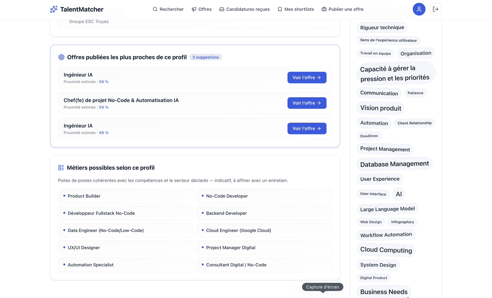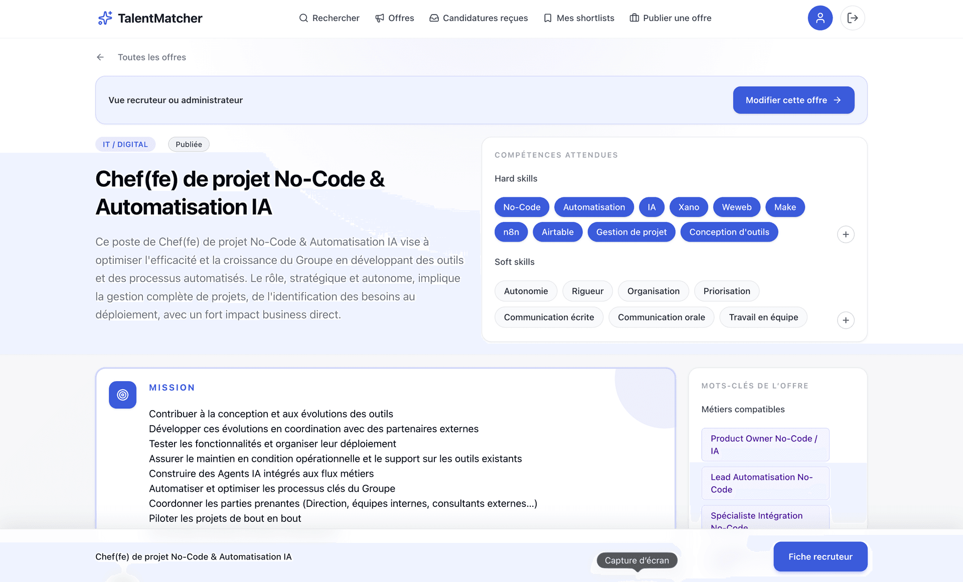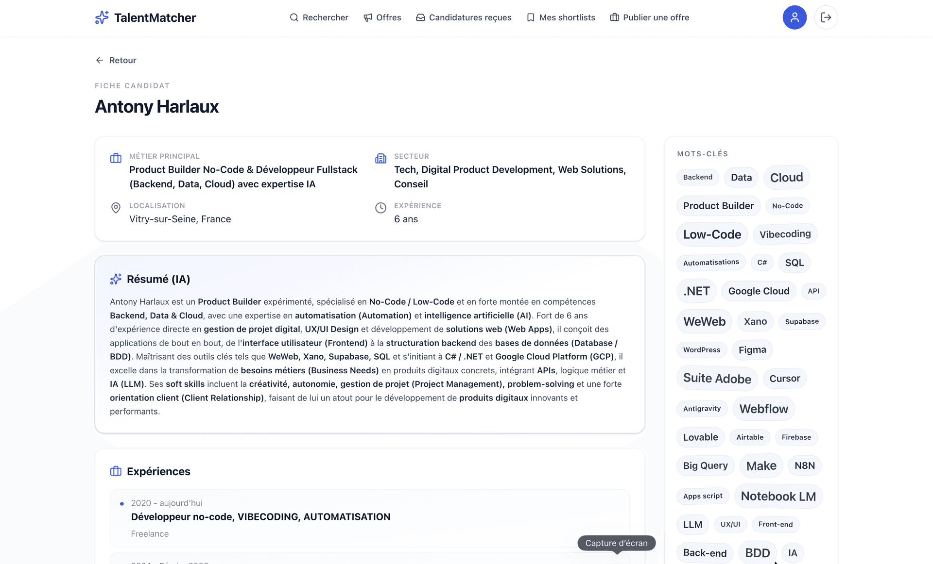 Les CV sont optimisés et enrichis en un clic et les profils sont scorés et classés par pertinence réelle, le tout grâce à l'IA.