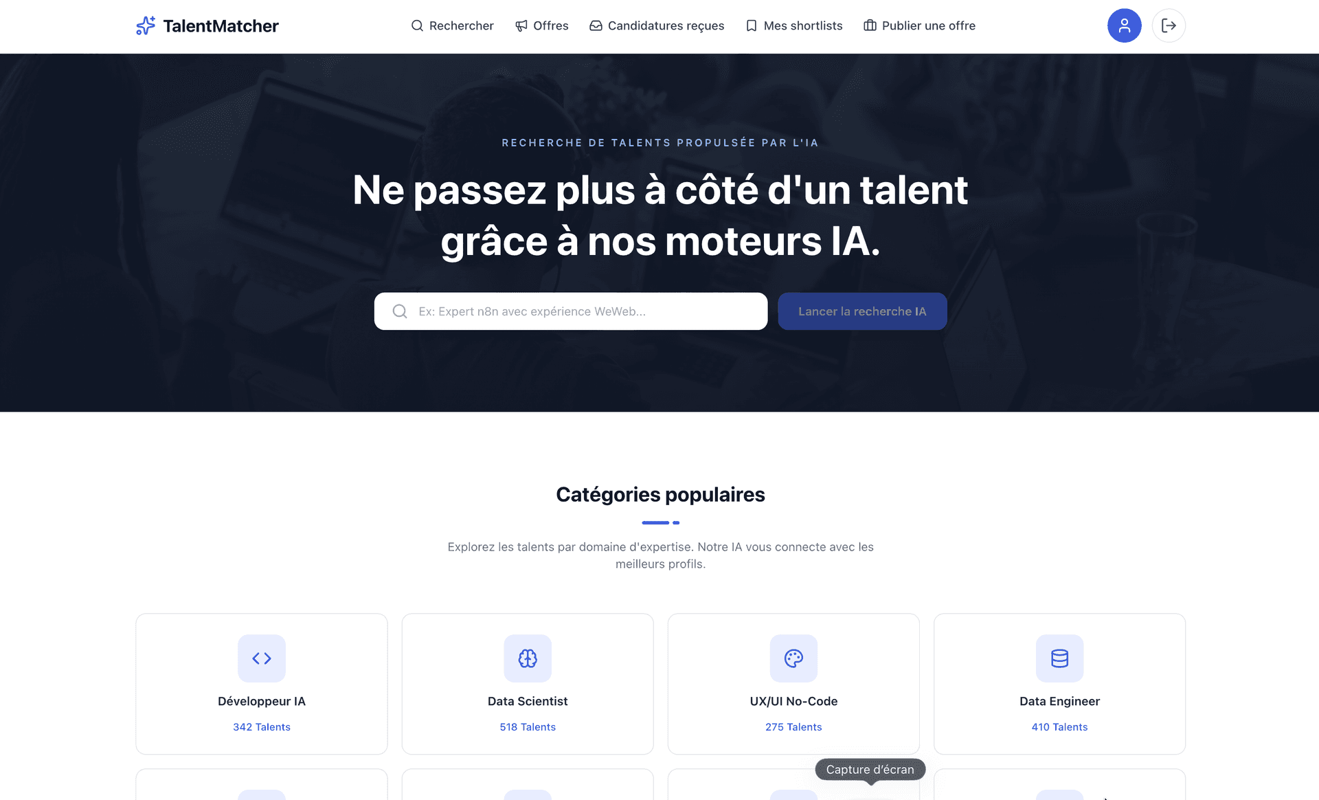 Un moteur capable de trouver des profils pertinents même sans correspondance exacte de mots-clés — basé sur la compréhension du sens, pas de la forme.