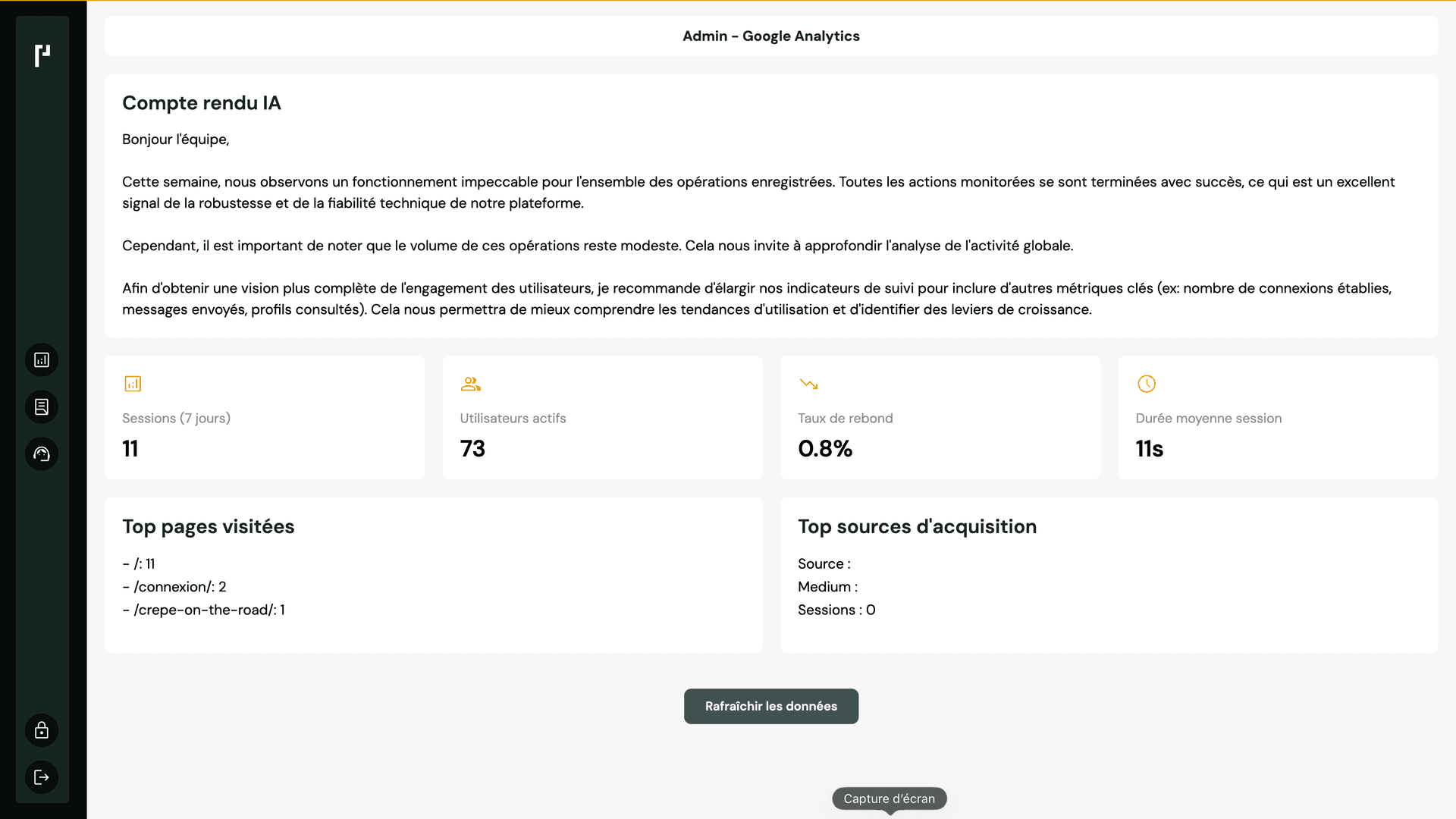 Plateforme opérationnelle avec un pipeline de données complet, un système d'analytics automatisé et une expérience utilisateur pensée pour des non-techniciens.